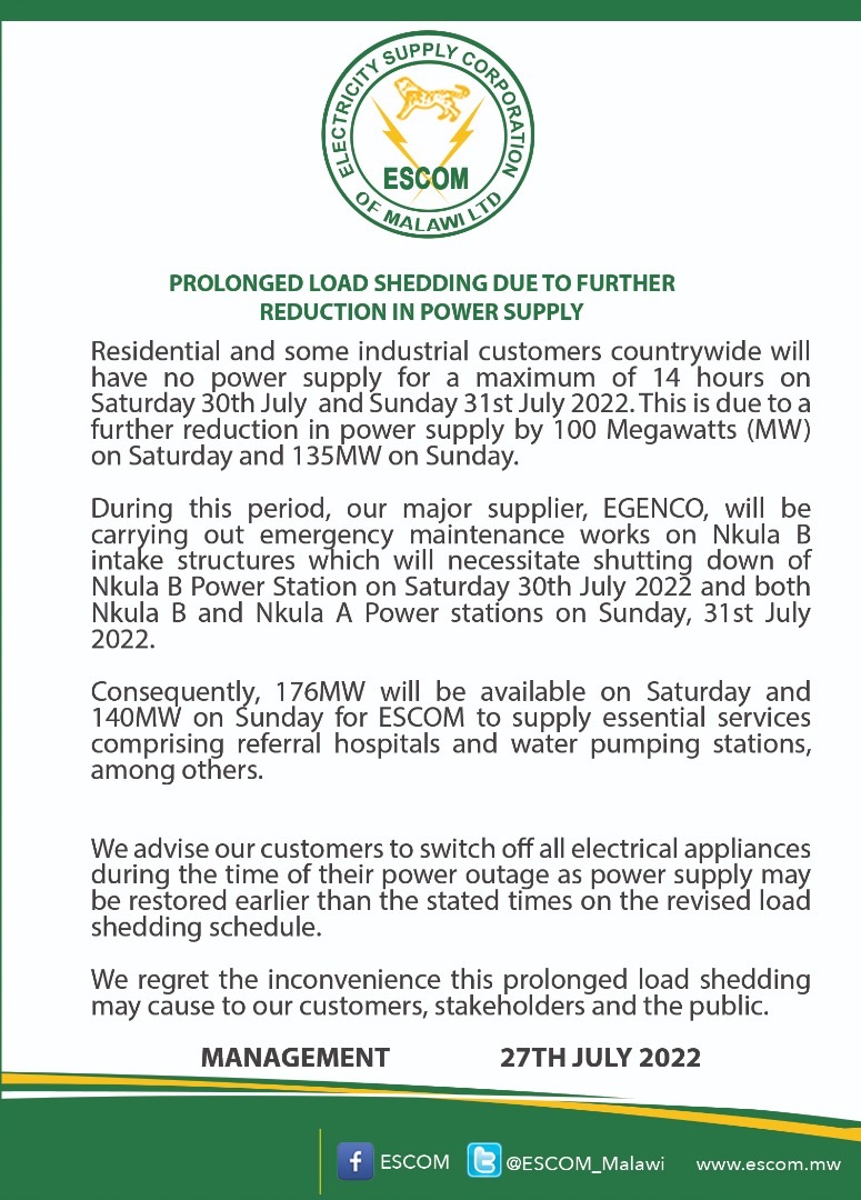 Only for Electricity Supply Corporation of Malawi (ESCOM) to come up up with its own notice, saying the outage is expected to last 14 hours on both days, but ESCOM Chief Executive Officer (CEO), Kamkwamba Kumwenda explains that theirs’s “is commutative” in that its includes normal load shedding currently on schedule.