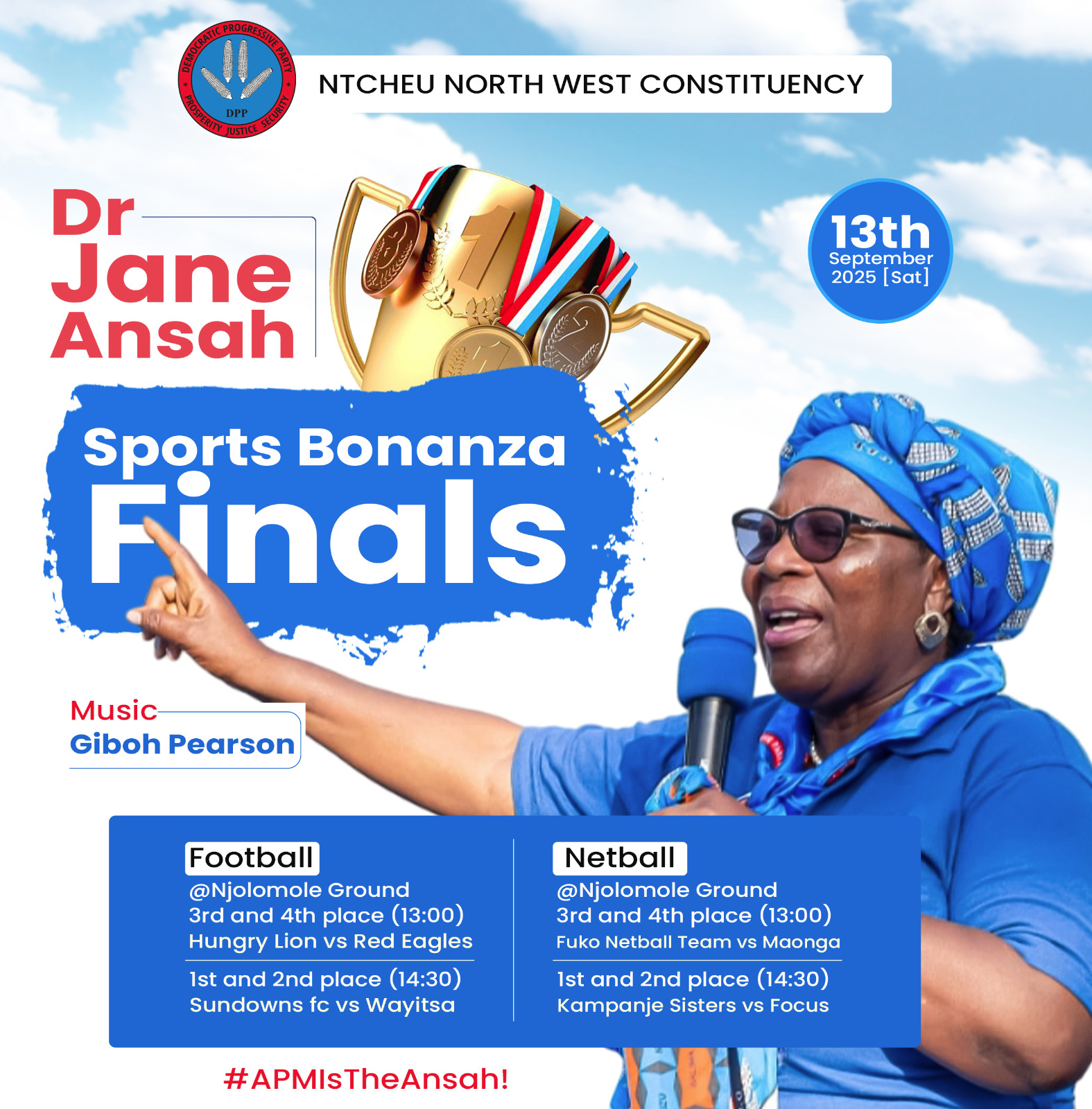 Democratic Progressive Party (DPP) presidential running mate, Justice Dr. Jane Ansah, will this Saturday light up Njolomole Ground in Ntcheu North West Constituency as guest of honor at the grand finals of a sports bonanza that has gripped the district for weeks.